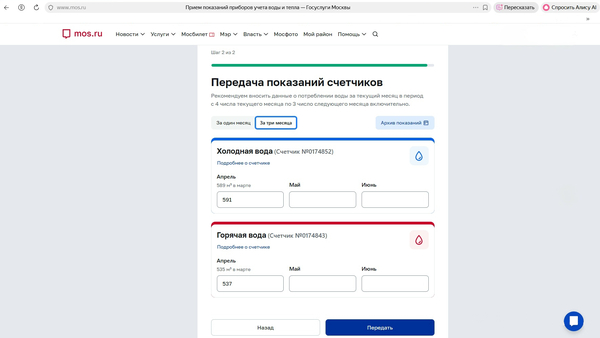 На портале mos.ru есть удобная функция, позволяющая передать показания счетчиков воды не только за текущий месяц, но и заблаговременно, на срок до двух месяцев вперед.